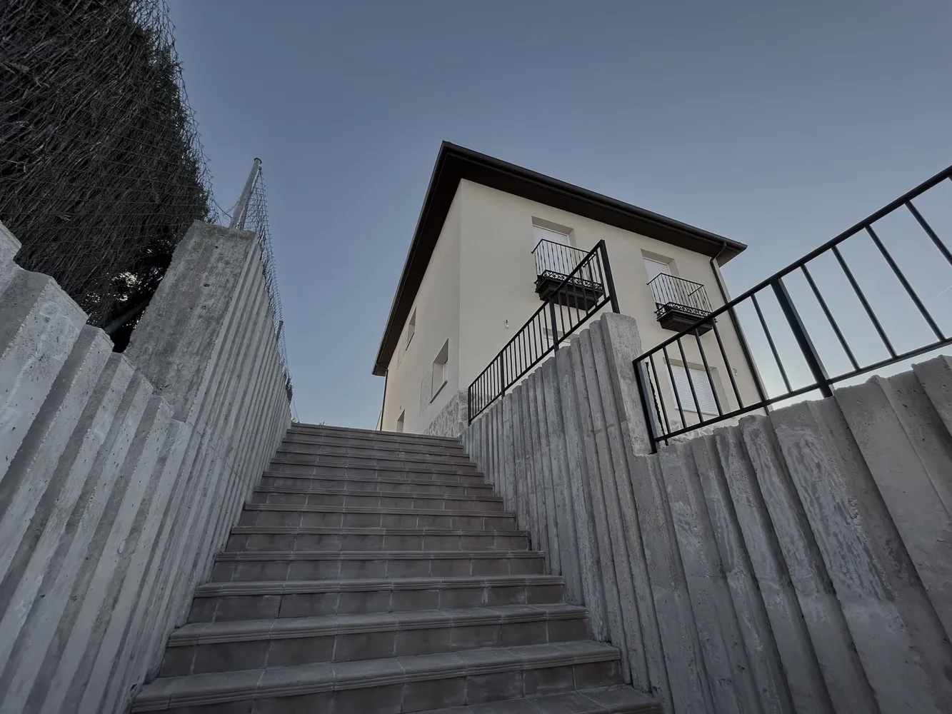 La situación privilegiada de la vivienda elevada suficientemente sobre la cota de calle confieren un gran protagonismo al necesario muro de contención que se articula para romper la horizontalidad del mismo.